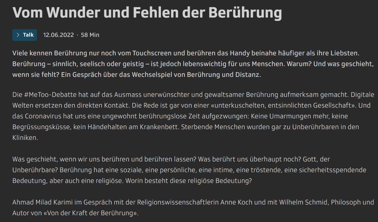 Berührung besteht aus verschiedenen Facetten und kann aus unterschiedlichen Perspektiven betrachtet werden. In der SRF Sendung Sternstunde Religion wird sie beispielsweise aus philosophischer und religiöser Sichtweise reflektiert. Die Sendung geht 1h und ermöglicht interessante Einblicke in geschichtliche Hintergünde sowie eine Diskussion über transzendente Berührung.